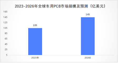 预计2023-2026年,全球车用PCB市场规模将从105亿美元增至145亿美元。当下汽车电子在整车中成本占比不足30%,仍有一定提升空间。