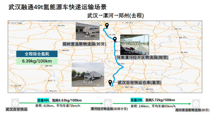 根据融通汽车数据,“武汉-郑州”运营线应用的“汉界-融通720”在往返全程约960公里,总重40吨的情况下,往返综合氢耗仅为6.75kg/100km。在不同阶段的运输中,去程综合氢耗可达6.39kg/100km,回程综合氢耗可达6.27kg/100km。这一能耗水平在经济性上对比内燃重卡已经具备了经济性,同时体现了零碳排放的节能环保优势,体现了氢能商用车在干线物流运输上的巨大潜力。