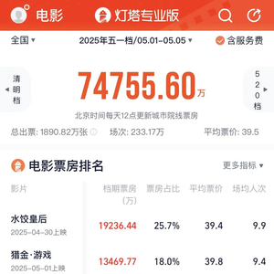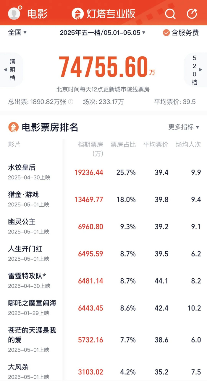 据灯塔专业版数据,2025年五一档(5月1日-5月5日),总票房7.48亿元,观影人次超1890万,总场次233.17万。
