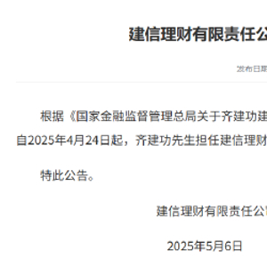 5月6日金融一线消息,建信理财发布公告称,根据《国家金融监督管理总局关于齐建功建信理财有限责任公司董事、董事长任职资格的批复》,自4月24日起,齐建功担任建信理财有限责任公司董事、董事长。