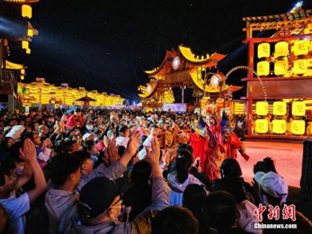 资料图:5月3日晚,市民和游客在天津武清运河不夜城文化主题街区观看演出,全维度感受穿越千年运河流域周边省市的绝美风光与人文故事。中新社记者 佟郁 摄