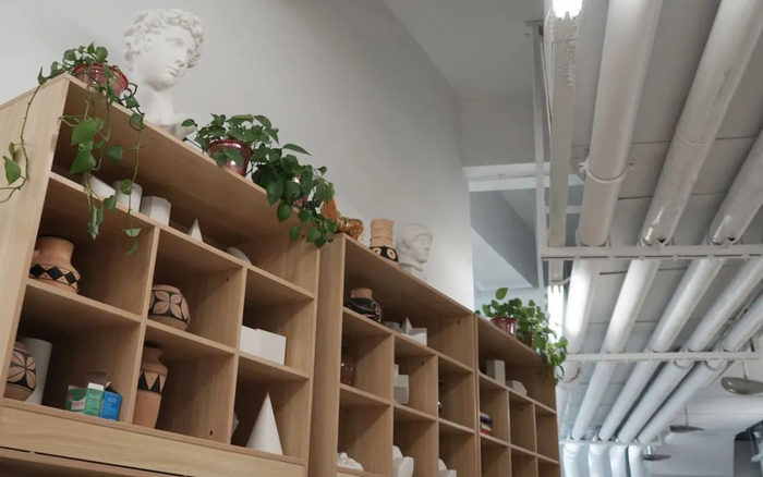 美术生专用画室位于综合体西侧,空间宽敞、明亮,整体设计美学呈现一种简洁的轻工业风格,通过色彩搭配及区域划分,巧妙地将屋顶外露的管线融入整体,线条交织,明亮轻快,充分呈现了自由、不拘一格的后现代主义建筑精髓。