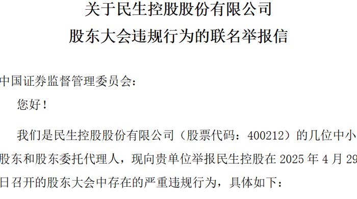 事件发生后,5月1日,前深乾联合诸多中小股东和股东委托代理人向中国证监会提交举报信,举报民生5在4月29日股东大会中存在的违规行为。