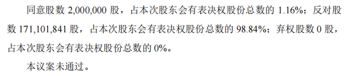 从公司公告的股东大会结果来看,现场出席和授权现场出席本次股东会的股东共19人,持有表决权的股份总数1.73亿股,占公司有表决权股份总数的32.55%。其中,同意200万股,占表决权股份总数的1.16%;反对1.71亿股,占比高达98.84%。备受关注的议案一和议案二均未表决通过,会议所有提案均被否决。