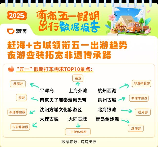 这个假期,非遗深度体验出圈。滴滴出行数据显示,前往古城古镇古街的打车需求同比去年上涨46%,其中泉州古城、大理古城、大同古城进入五一全国打车需求前十景点。不少景区推出夜间深度游活动,具有灯光造景、非遗集市、沉浸式演绎等夜游核心吸引物的文旅街区打车需求火爆。长沙太平老街历史文化街区、唐山河头老街、无锡清名桥历史文化街区、南京夫子庙秦淮风光带、西安大唐不夜城等夜间打车需求占比过半。