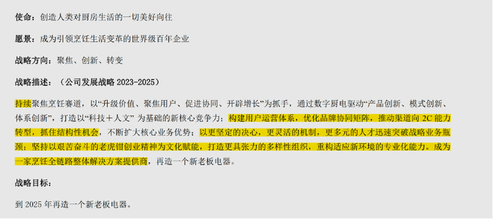 2023年,老板电器将发展战略从“专注烹饪,聚焦吸油烟机,扩大第一品类优势、领先第二品类,稳步推进第三品类”,进一步更改为“聚焦烹饪赛道,持续扩大核心业务优势,迅速突破战略业务瓶颈,构建以“科技+人文”为基础的核心竞争力”,并且要实现“到2025年再造一个新老板电器”。
