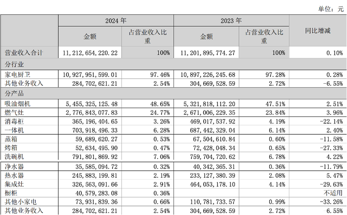 财报显示,老板电器2024年营收112.13亿元,同比增长仅0.1%,险些失守为负增长,同时考虑到2024年的家电国补,老板电器的营收并不及格。