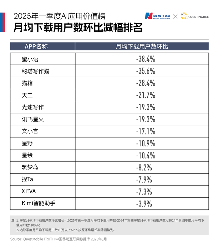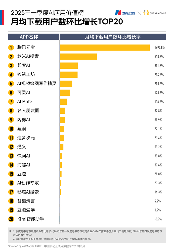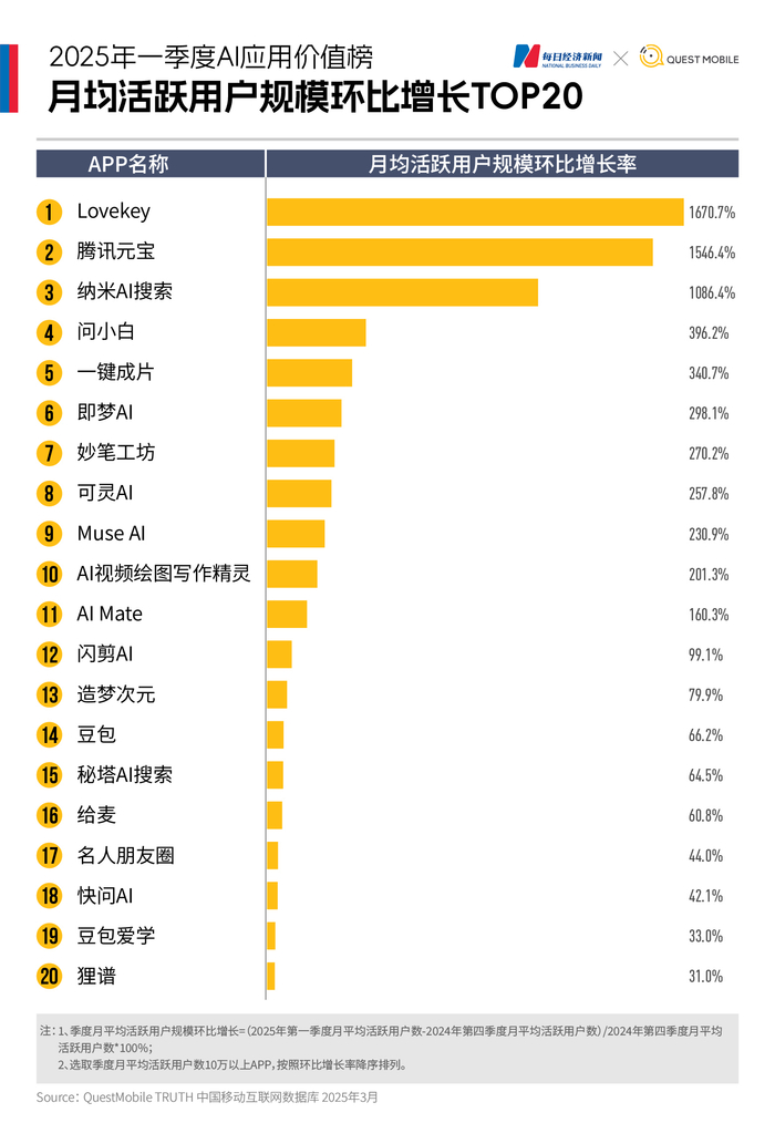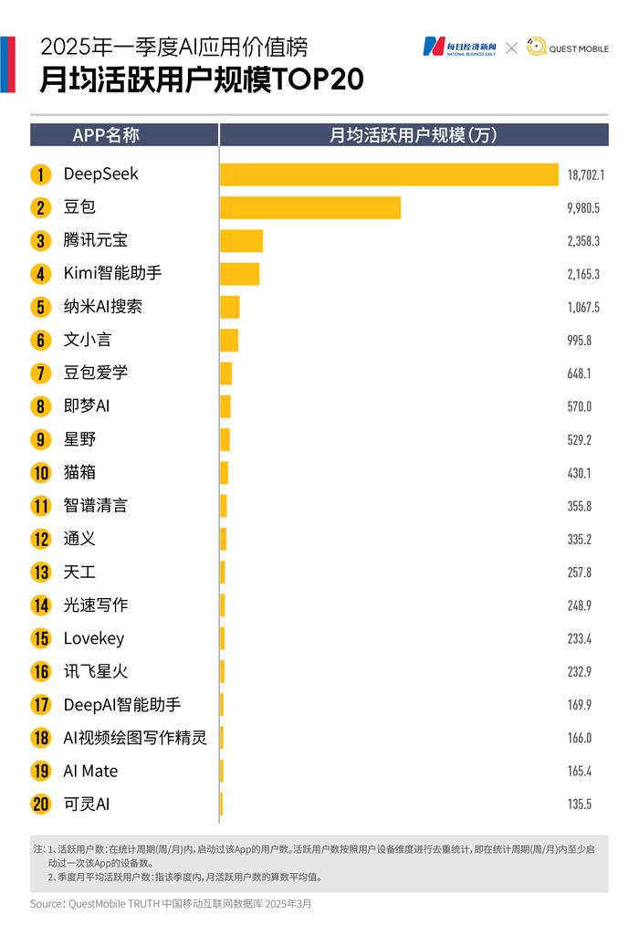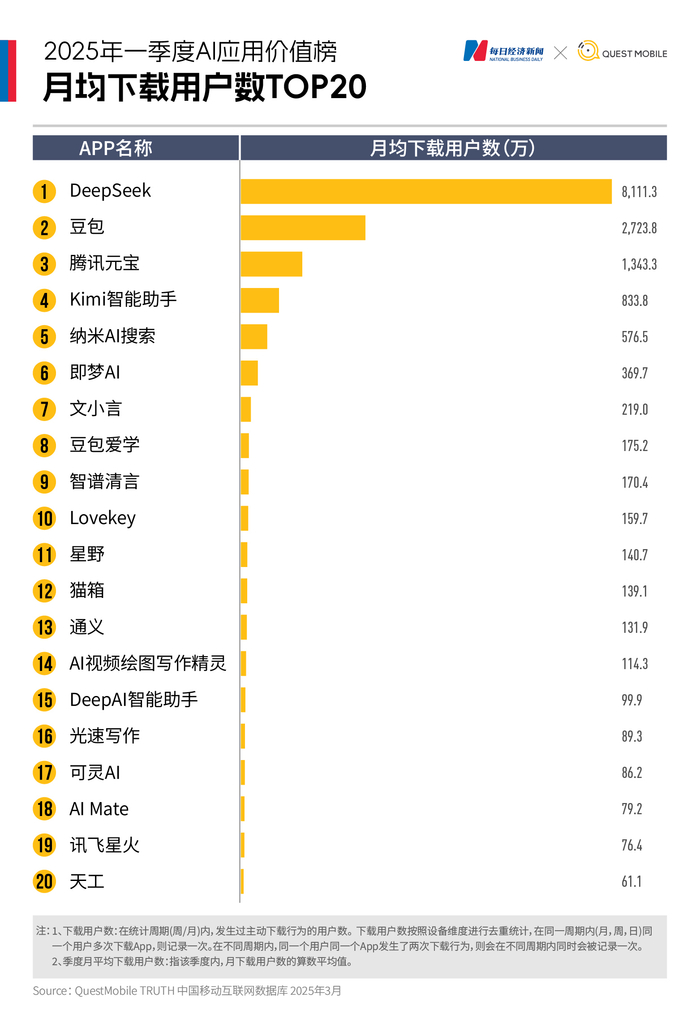 《每日经济新闻》联合QuestMobile发布《2025年一季度AI应用价值榜》,基于下载量与月活跃用户数(MAU)两大核心指标,精准捕捉了这场变革的关键脉络。