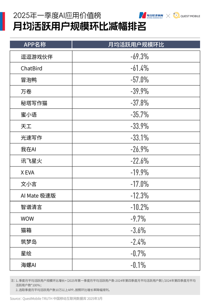 免责声明:《2025年一季度AI应用价值榜》(简称“本报告”)所涉及的数据来源于QuestMobile自有数据库、行业公开、市场公开资料等。本报告力求但不保证该信息的完全准确性和完整性。
