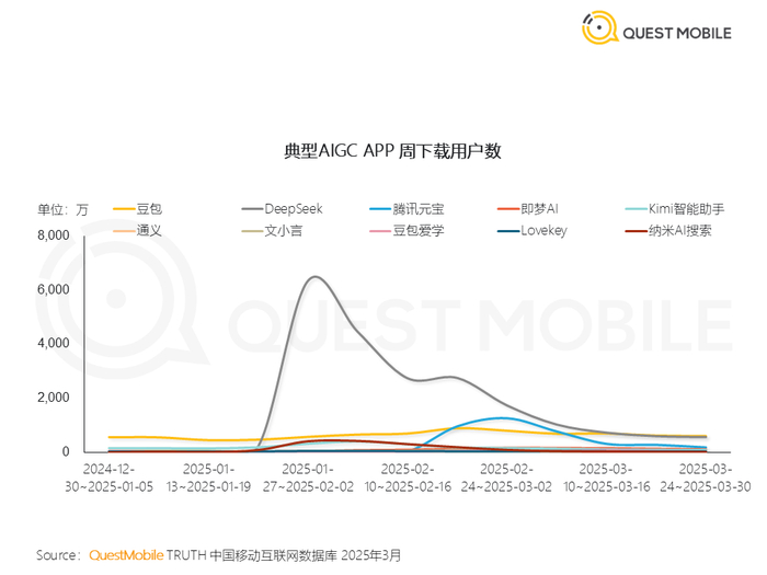 ◆ 新闻解读:DeepSeek的成功,一方面得益于其强大的模型能力被市场快速认可(甚至被腾讯元宝、百度文小言等竞争对手接入),另一方面也反映了用户对高性能通用AI助手的初步需求已被点燃。DeepSeek的领先地位使其成为其他应用(如腾讯元宝)借力的对象,但也面临如何将庞大用户转化为持续活跃和商业价值的挑战。(注:DeepSeek App于1月11日上线,MAU环比增长数据缺失,月均下载量和月活用户数均取用的是2月和3月的平均值,未来其用户粘性与增长持续性是关键看点)
