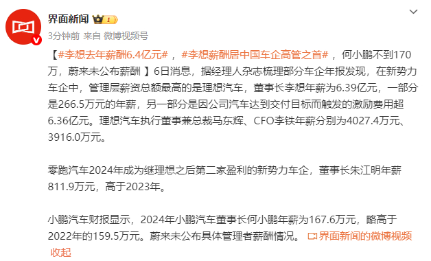 媒体:李想去年薪酬近6.4亿 ,居中国车企高管之首,何小鹏不到170万