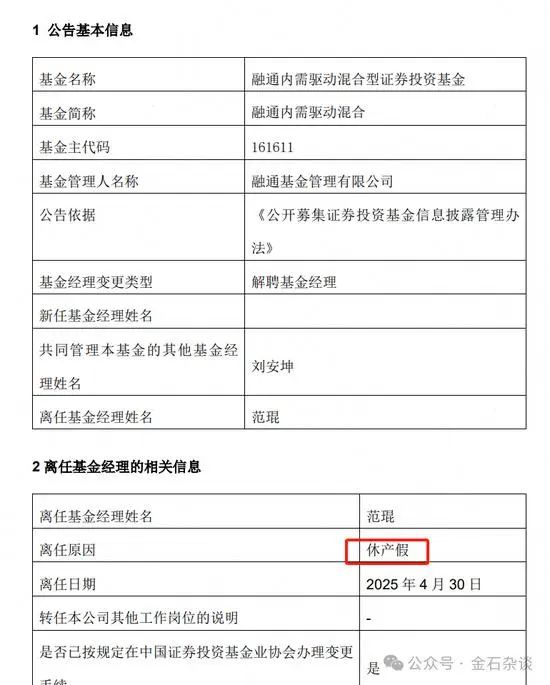 市场彼时已有猜测,而此次公告中“休产假离任”的表述,被业内视为“彻底离职”的信号——按惯例,若仅为短期休假,无需在中基协办理变更手续。