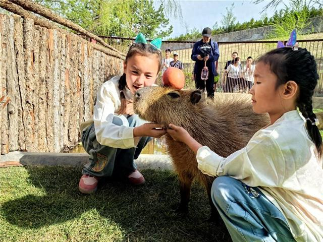 5月5日,在鄂尔多斯野生动物园,新引进的卡皮巴拉(水豚)与孩子们互动玩耍。