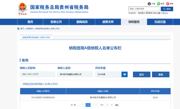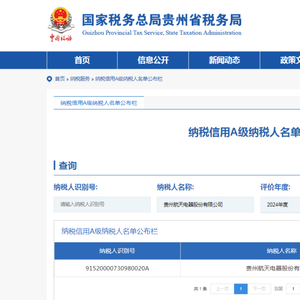 日前,国家税务总局贵州省税务局公布2024年度纳税信用等级评价结果,航天电器再次获评“纳税信用A级纳税人”,这是航天电器自2014年来连续第十年荣获此称号,成为行业内诚信纳税的标杆企业。同时航天电器所属子公司上海研究院、林泉电机、江苏奥雷、遵义精星、威克鲍尔均获得“纳税信用A级纳税人”称号。