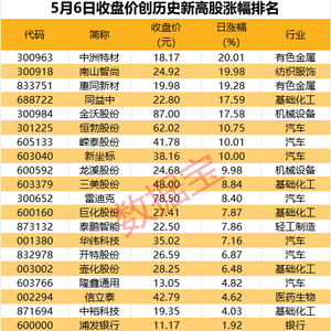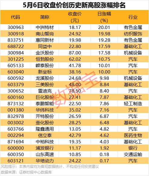 从股价表现看,收盘价创历史新高股中,今日股价平均上涨9.29%,涨停的有中洲特材、南山智尚、嵘泰股份等,涨幅居前的有惠同新材、同益中、金沃股份等。