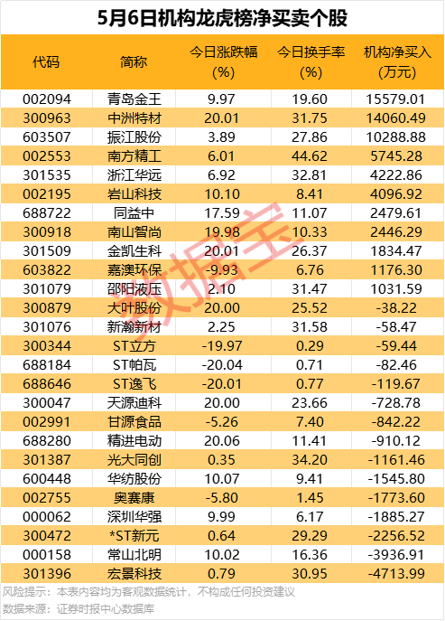 5月6日龙虎榜中,共11股获机构净买入超千万元,青岛金王获机构净买入1.56亿元,净买入居首,其次是中洲特材、振江股份,机构净买入均超1亿元。