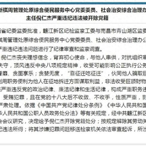 据江西“赣江发布”近日消息,经江西省纪委监委批准,赣江新区纪检监察工委与南昌市青山湖区监委对倪仁杰严重违纪违法问题进行了纪律审查和监察调查。