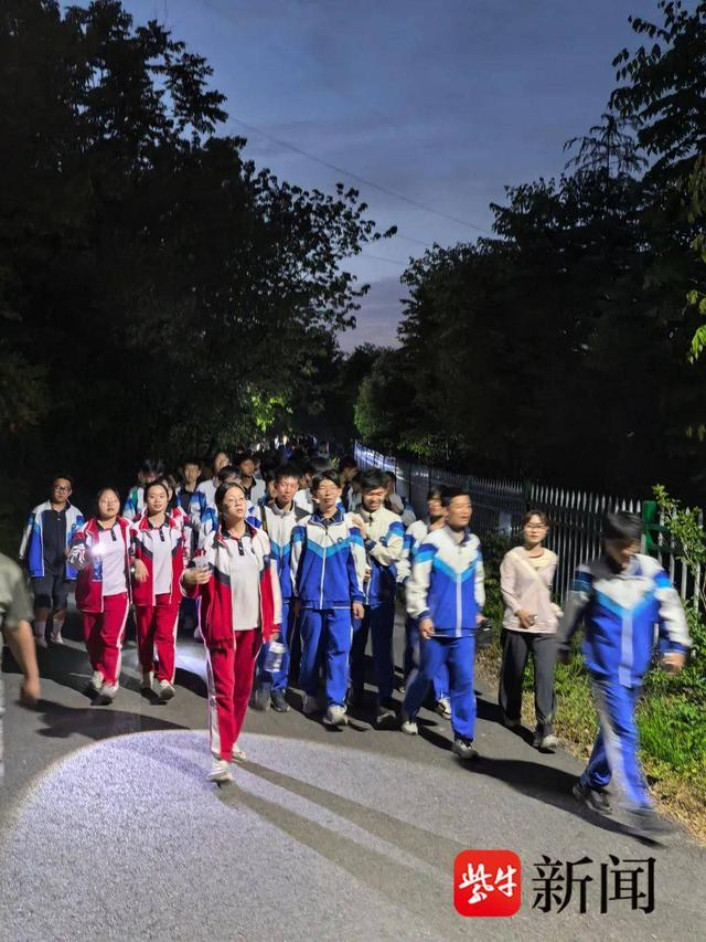 暮色四合,同学们扛着班旗,带着手电、喇叭,伴着虫鸣蛙叫,开启了全程7公里的夜行远足。一路有农庄小院,鸡犬相闻,有水库堤坝,漫天繁星,更有青春的歌,相伴同行。