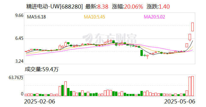 5月6日精进电动(688280)收盘价8.38元,收盘涨停,全天换手率11.41%,振幅14.79%,成交额4.74亿元。科创板交易公开信息显示,当日该股因日收盘价涨幅达15%等上榜。