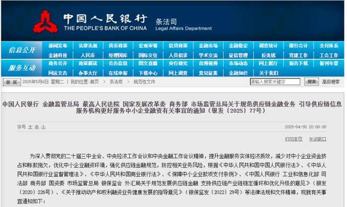 近日,中国人民银行联合金融监管总局、最高人民法院等五部门正式发布《关于规范供应链金融业务引导供应链信息服务机构更好服务中小企业融资的通知》(银发〔2025〕77号)。与2月6日征求意见稿相比,正式文件在供应链金融模式创新、风险防控机制、信息数据管理等领域作出多项关键调整,进一步明确政策边界,强化对中小企业融资的支持力度。本文将从条款的关键变化出发,为读者解析新规的政策导向及行业影响。