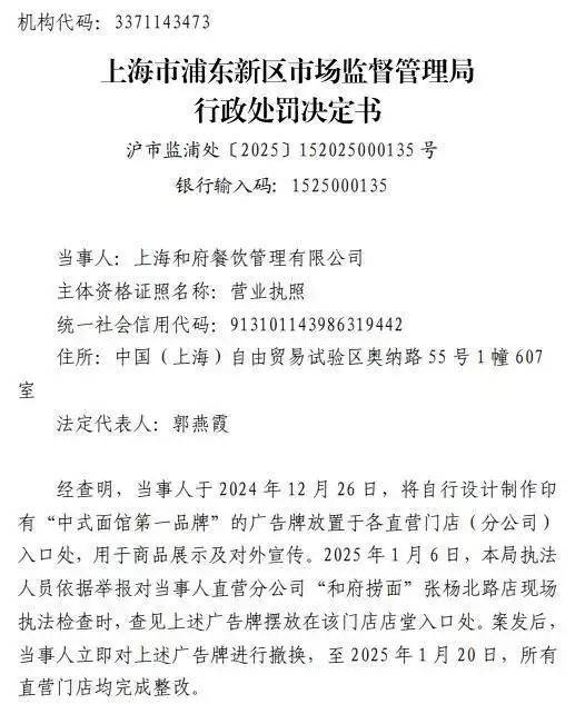处罚事由显示,当事人于2024年12月26日,将自行设计制作印有“中式面馆第一品牌”的广告牌放置于各直营门店(分公司)入口处,用于商品展示及对外宣传。2025年1月6日,执法人员依据举报对当事人直营分公司“和府捞面”张杨北路店现场执法检查时,查见上述广告牌摆放在该门店店堂入口处。案发后,当事人立即对上述广告牌进行撤换,至2025年1月20日,所有直营门店均完成整改。