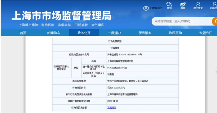 2025年5月,上海市市场监督管理局网站显示,上海和府餐饮管理有限公司,因发布广告使用国家级、最高级、最佳等用语,违反广告法,被上海市浦东新区市场监督管理局罚款3万元。