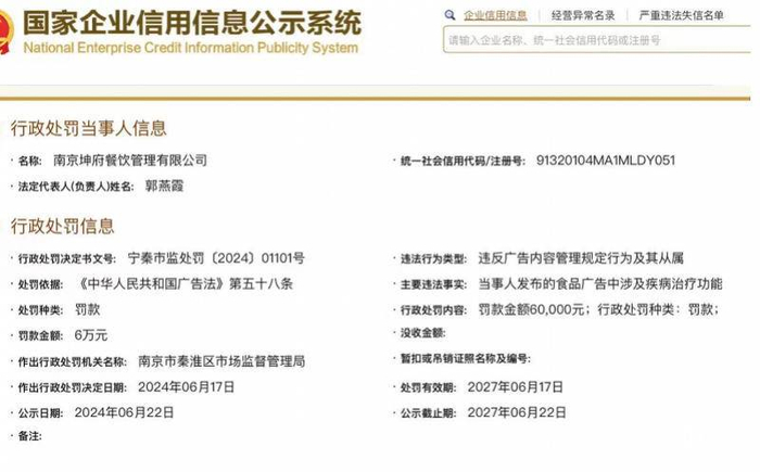 记者注意到,“和府捞面”类似营销宣传被罚也不是第一次了,2022年和府捞面自行设计制作“累销3亿碗”以及“大众点评五星面馆”字样的宣传海报,悬挂于店门外。经核实上述宣传内容与实际情况不符被罚。紧接着上海和府餐饮管理有限公司宝山第二分公司(和府捞面宝山万达店),举办会员回馈抽奖活动时,设定最高奖项为“特斯拉Model3五年免费使用权”,其市场价值超过五万元被罚。 2024年和府捞面子公司南京坤府餐饮管理有限公司在发布的食品广告中,涉及疾病治疗功能,违反了广告内容管理规定,依据《广告法》第58条规定,被南京市秦淮区市场监督管理局罚款6万元。据了解涉事产品已下架。