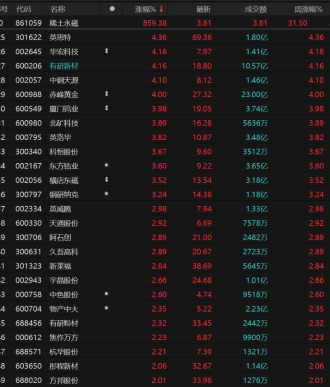 其中,稀土永磁板块表现亮眼。稀土永磁概念指数早盘急拉,截至午盘涨3.81%,5只相关个股涨停,北交所个股九菱科技涨幅超25%。