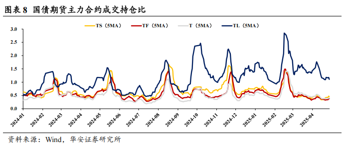 成交持仓比方面,TL合约成交持仓比下降,其余期货合约成交持仓比上升。截至4月30日,5MA视角下TS/TF/T/TL期货合约成交持仓比分别为0.45/0.38/0.40/1.11,较上周五分别上升0.03/上升0.05/上升0.01/下降0.07。