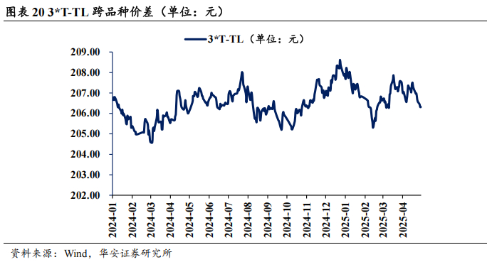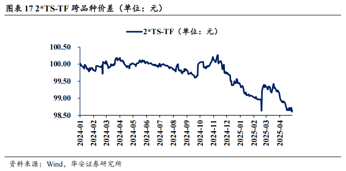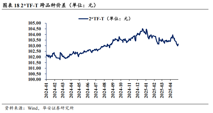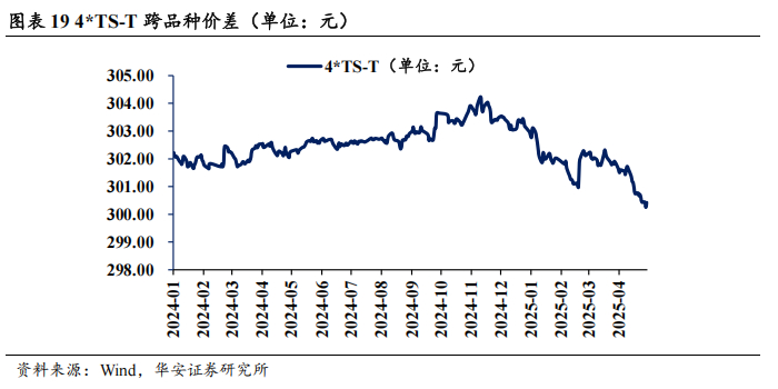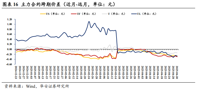 跨期价差方面,T合约价差收窄,TL合约价差不变,其余主力期货合约价差均走阔。截至4月30日,TS/TF/T/TL合约近月-远月价差分别为-0.26元/-0.30元/-0.14元/-0.27元,较上周五分别-0.01元/-0.01元/+0.02元/+0.00元。