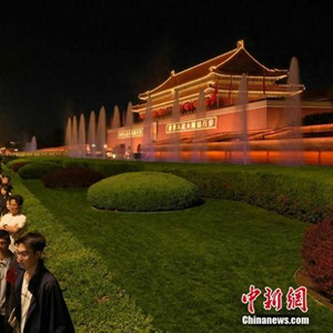 5月2日,北京天安门迎来全国各地游客。图为游客欣赏天安门城楼前的音乐喷泉。中新社记者张炜摄