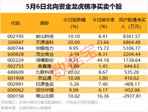 今日龙虎榜现身个股中,北向资金净买入超5000万元的有3只,分别是岩山科技、天源迪科、华银电力。