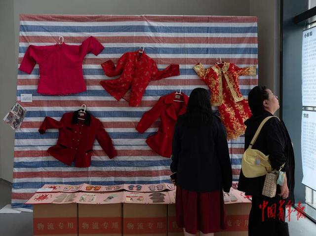 5月5日,北京市昌平区回龙观文化艺术中心,两位观众参观“女性和她的物”展览中展出的不同年代劳动女性的婚服。该展览展出了许多基层流动女性捐献的个人物件,从手工织物到承载着个体职业发展的证件、服饰、照片等。北京木兰花开社工服务中心负责人齐丽霞说:“我们用物件承载着真实的记忆,用真实故事传递女性代际之间的相互托举。”她介绍,这场公益展览也是对女性劳动群体的致敬,让更多人看见劳动者的智慧与坚韧、看见女性在家庭中的劳动与价值。中青报·中青网记者 李峥苨/摄
