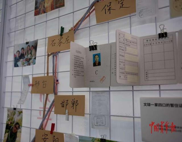 5月5日,北京市昌平区回龙观文化艺术中心,“女性和她的物”展览中展出的女工文琼和家人的暂住证。该展览上展出了许多基层流动女性捐献的个人物件,从手工织物到承载着个体职业发展的证件、服饰等。中青报·中青网记者 李峥苨/摄