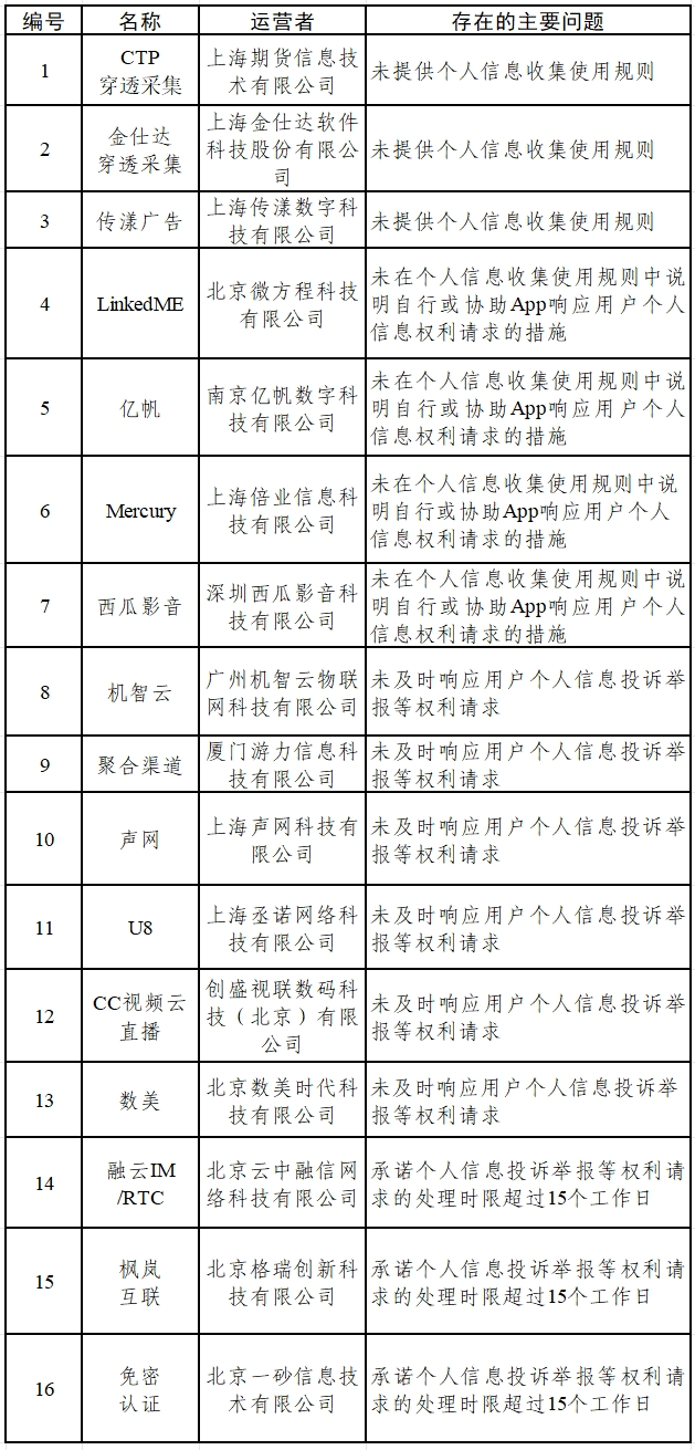 二、CTP穿透采集、金仕达穿透采集等16款SDK收集使用个人信息,存在未提供个人信息收集使用规则,未说明自行或协助App响应用户个人信息权利请求的措施,未及时响应用户个人信息投诉举报等权利请求等问题(详见下表)。