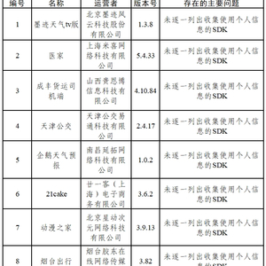 一、墨迹天气tv版、医家等15款App存在未逐一列出收集使用个人信息的SDK,未准确列出SDK收集使用个人信息的目的、方式、范围等问题(详见下表)。