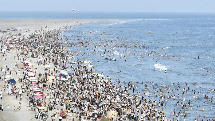 5月4日,游客在广西北海银滩国家旅游度假区戏水(无人机照片)。 “五一”假期期间,各地推出丰富多彩的旅游产品供给,加强文旅融合和科技赋能,提升管理水平和服务品质,带动旅游消费欣欣向荣。 新华社发(李君光 摄)
