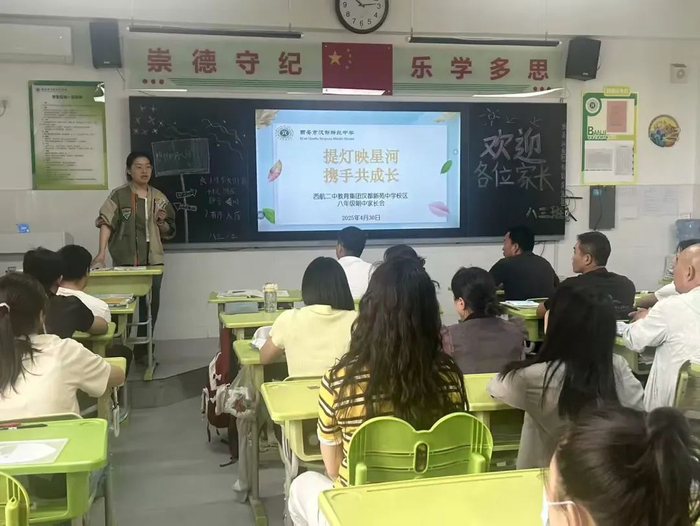 阳光讯(记者 梁永飞 通讯员 李欣)四月是春的季节,蓝天白云,晴空万里。校园的春天如约而至,微风拂过是春的味道,阳光透过是春的温度。为进一步加强家校沟通,使家长更好地了解学校,促使孩子全面发展,2025年4月30日,西安市未央区西航二中教育集团汉都新苑中学校区迎来了初2026届期中家长会。