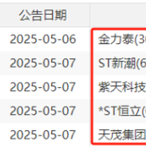 紫天科技、金力泰、*ST恒立、天茂集团也于2025年5月6日停牌。根据深交所相关规定,如股票停牌后两个月内公司仍未披露2024年年度报告,股票交易将被实施退市风险警示;若在股票交易被实施退市风险警示之日起的两个月内仍未披露2024年年度报告,深交所将终止其股票上市。