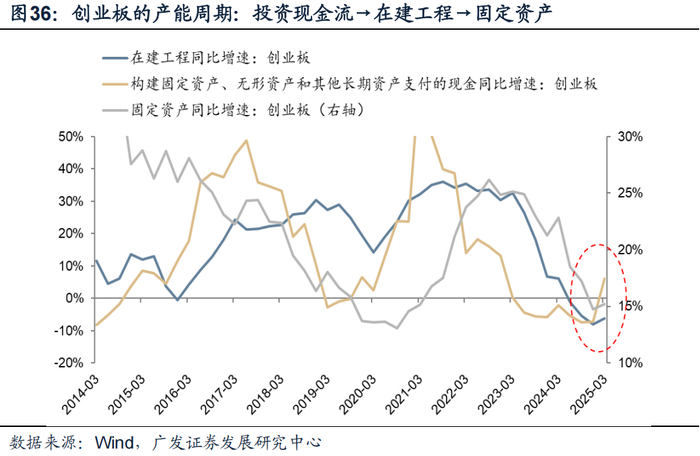 目前创业板的投资现金流已经转为回升,在建工程负增企稳,意味着创业板权重行业(例如新能源)的产能周期已经基本上接近底部。