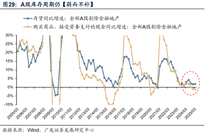但是内生恢复仍然偏慢,在4月关税冲击下仍不容乐观。ROE已经连续15个季度下滑,目前接近历史低点。企业极力收缩供给,但收入的恢复依然缓慢,资产周转率仍是主要拖累。筹资现金流存在压力,受到企业主动偿债和现金分红的影响。库存周期“弱而不补”,结构性补库存的行业主要由外需带动,后续则存在不确定性。