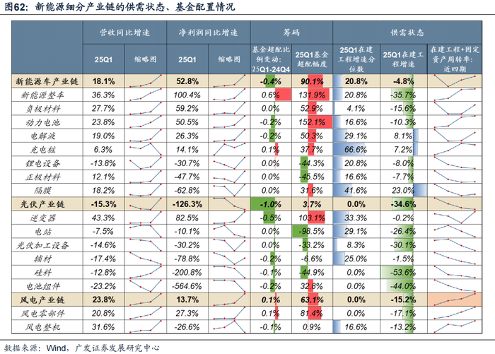 从产能出清的角度,市场一直较为关注25年新能源产业链的情况。新能源产业链的在建工程转负、意味着新增产能不再大幅增加,结构性存在供需均衡的子行业。考察产业链产能情况,在建工程大幅负增,且增速回落到了历史低位,Q1基金已经不再减仓甚至开始加配,集中在:风电零部件、新能源整车、动力电池、负极材料。