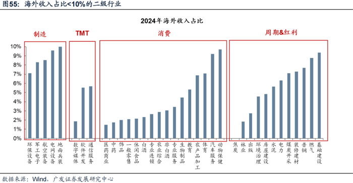 海外收入占比较低的行业:制造业中主要包括军工、电网设备,TMT中偏软件和运营,内需板块的消费品和服务业,以及典型的红利行业。