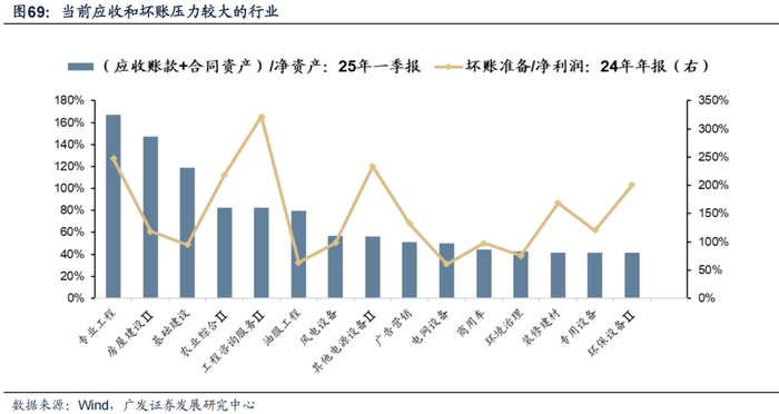 对应的,我们筛选最新应收类资产(应收账款+合同资产)/净资产>40%、坏账准备/净利润>60%的行业,这类行业应收账款及坏账压力最大。里面相对具备“To-G”属性的细分,有望最受益于化债,主要集中在建筑和环保的细分方向。