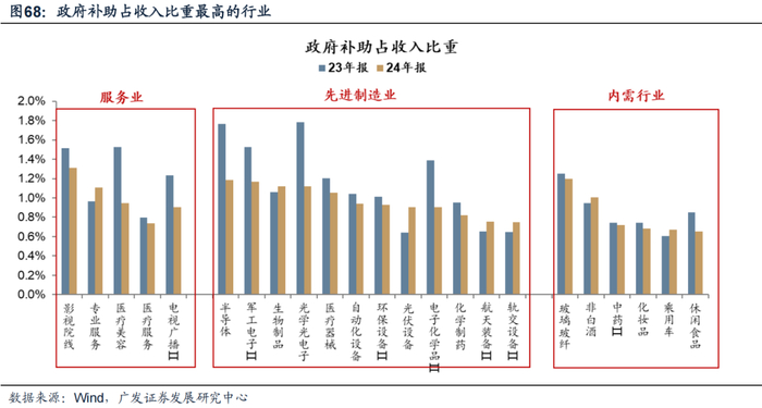 首先,上市公司接收到的政府补助可以反映政策层面的扶持力度。从23-24年政府补助/收入比重比较高的行业来看,近两年政府补助比较高的行业集中在服务业、先进制造业、以及一些内需行业。