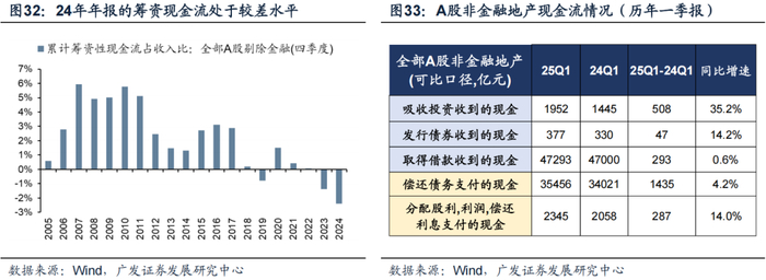 25年一季度,情况略有好转。随着财政前置、政策发力,企业筹融资已有所改善,吸收筹资收到的现金增速转正、发行债券收到的现金增速抬升。不过,由于偿还债务支出的现金规模仍大,对整体筹资现金流仍形成拖累。