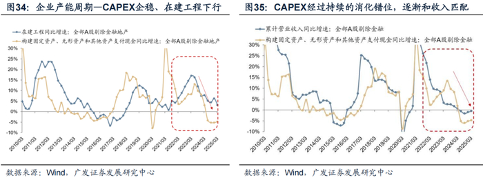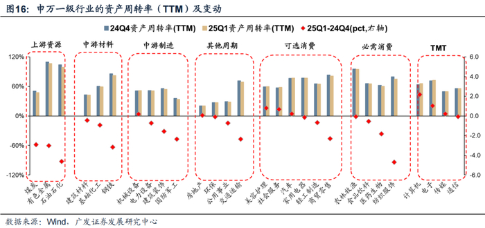 部分产能出清至底部的行业,在25年逐渐进入“困境反转”的拐点,表现为投资现金流及在建工程增速转负、资产周转率逐渐企稳。其中,如果是外需不敏感的行业,则意味着供需逐渐到达新的均衡点。