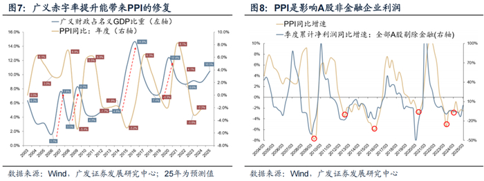 业绩预测的一条清晰的传导链条:狭义赤字 → 广义财政 → PPI → 利润及ROE。年内仍需留意接下来的政策对冲情况,若能够形成对于PPI的有效支撑,那么年内的盈利预测有望再度上修。