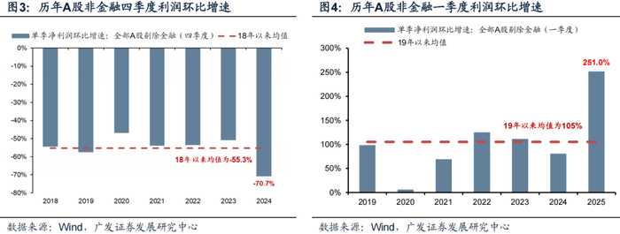 四季度单季A股非金融利润环比增速为-70.7%,略低于18年以来均值(-55.3%),但是25年一季报A股非金融利润环比增速为251%,显著高于19年以来105%的均值。