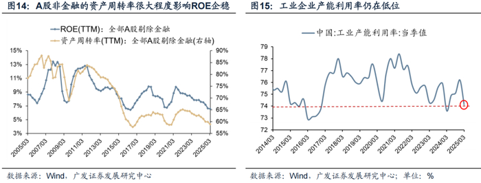 ROE继续下滑,ROE基本触及历史底部位置。25年一季报A股非金融ROE(TTM)下滑至6.58%。21年开始的本轮ROE下滑周期已持续了15个季度。